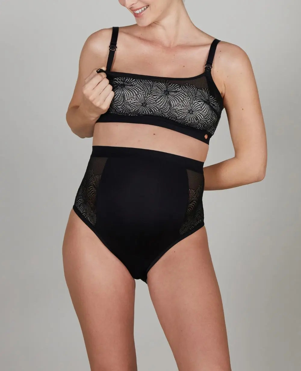 Val voor de Dahlia beugelloze zwangerschaps- en voedingsbeha met prachtig gebloemd kant. Een vleugje elegantie en charme gecombineerd met het comfort en gebruiksgemak van een echte bh.