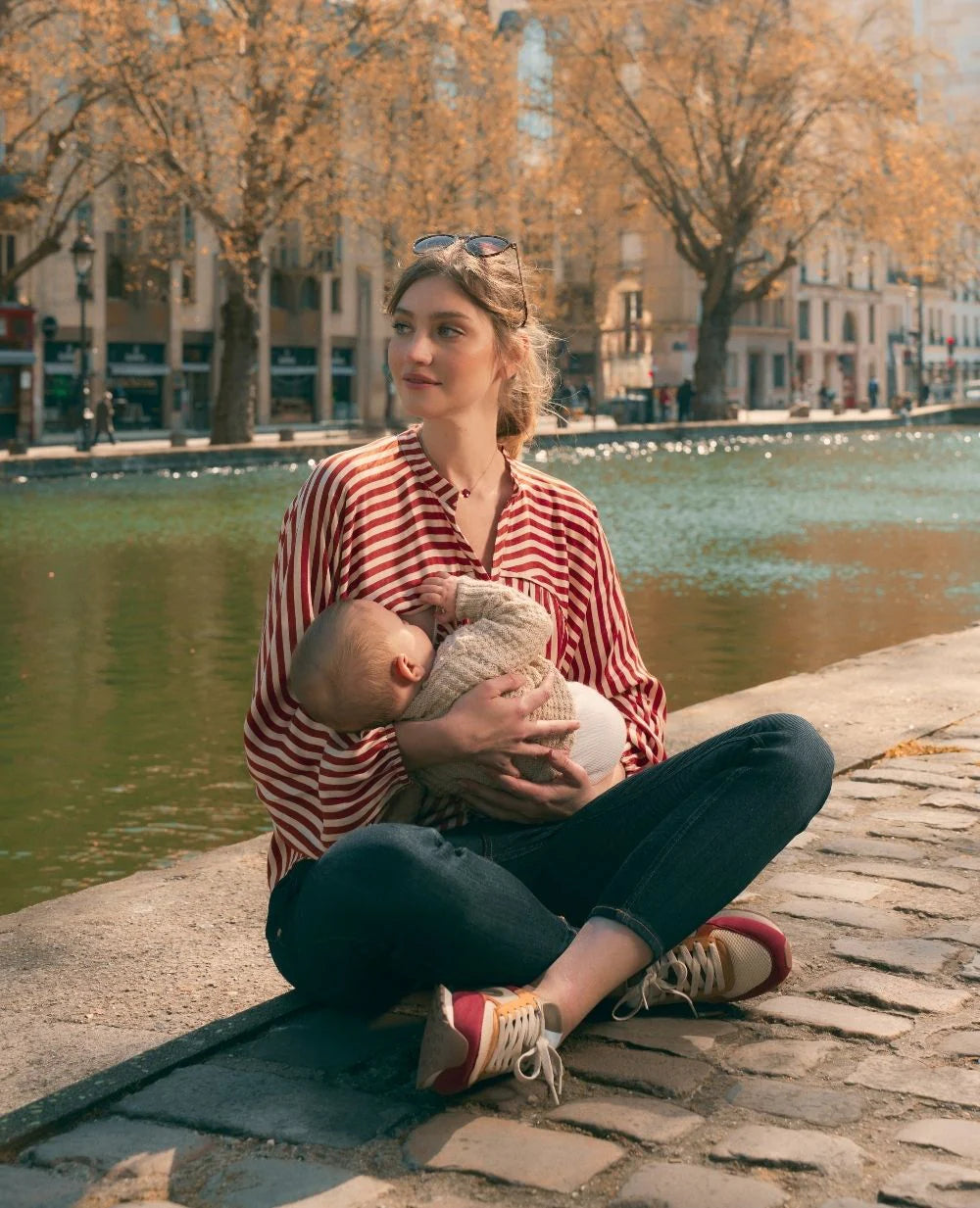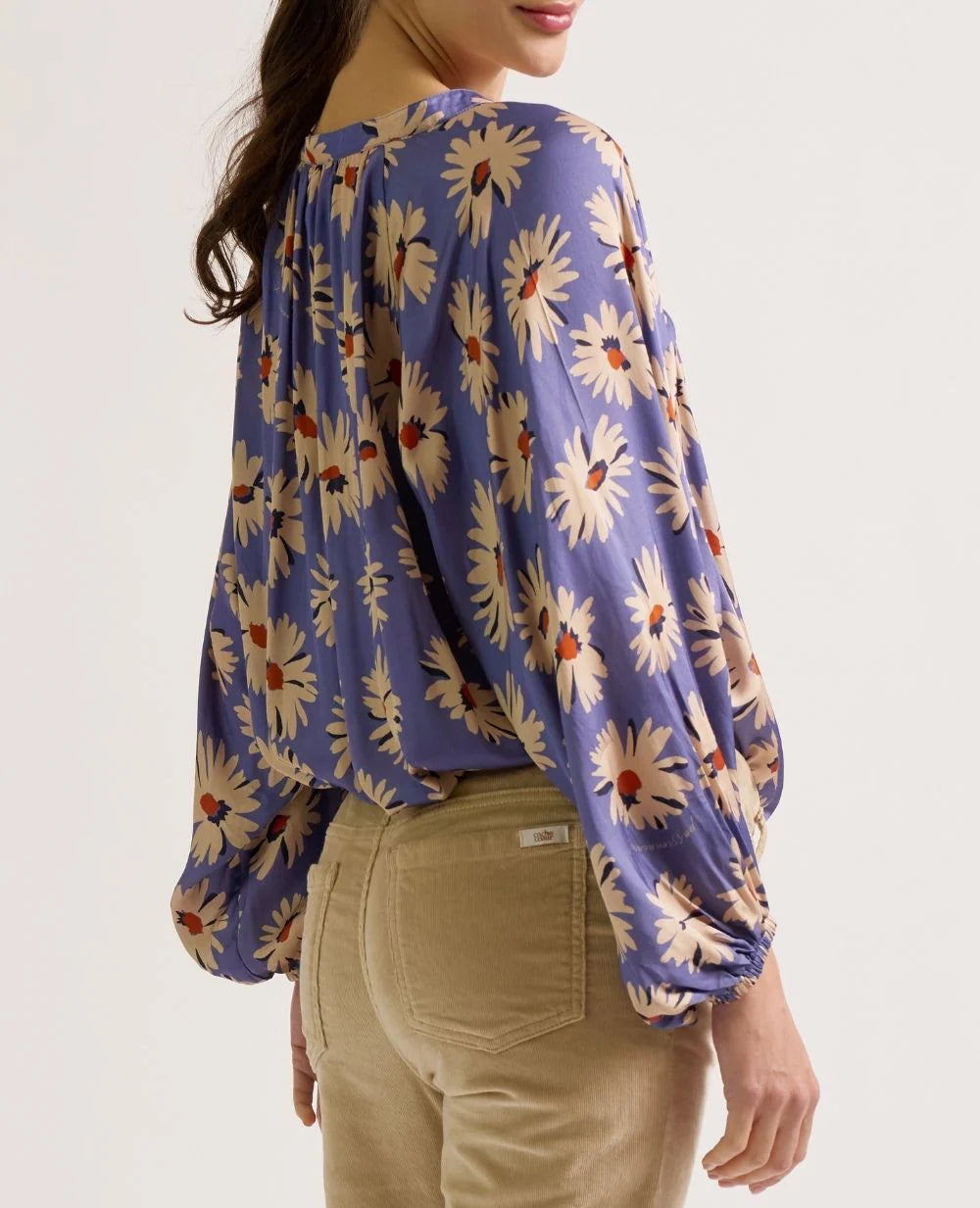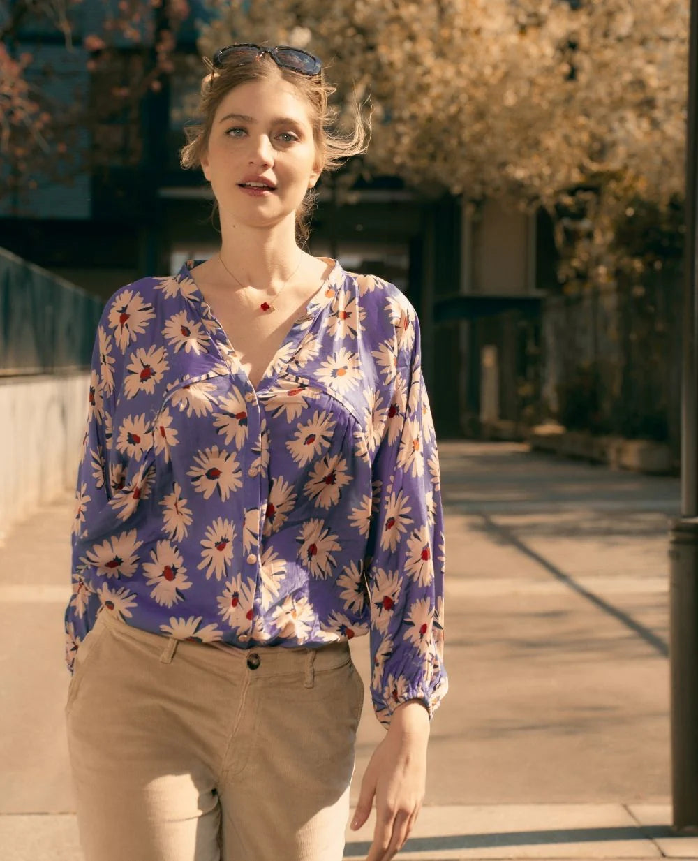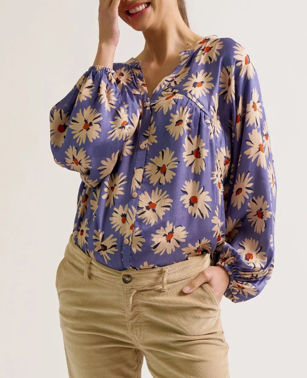 Met zijn vloeiende snit en zachte stof begeleidt de Madeleine blouse alle fasen van het moederschap. Gemaakt van een milieuvriendelijke 100% viscose, verleidt hij met zijn luchtige draperie en frisse print van kleine madeliefjes op een korenbloemblauwe achtergrond. De verborgen voedingsritsen in de uitsparingen zorgen voor discreet voeden.
