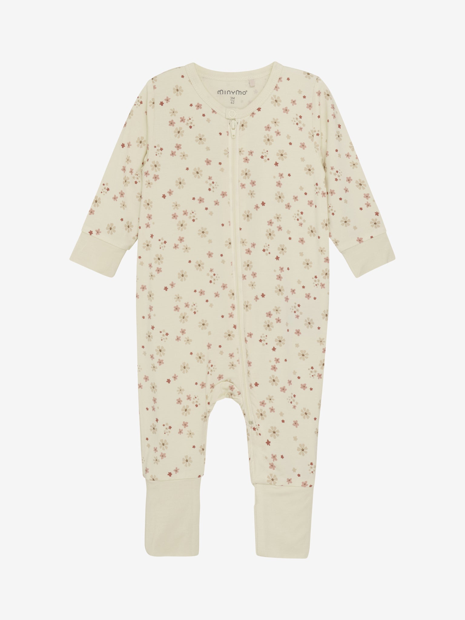 Nachtpak van MINYMO met all-over print. Het nachtpak heeft lange mouwen en pijpen en ribboorden bij de polsen en enkels. Bij de enkels kan de ribboord worden omgeslagen. Het nachtpak is gemaakt van bamboe viscose en sluit met een rits aan de voorkant.
