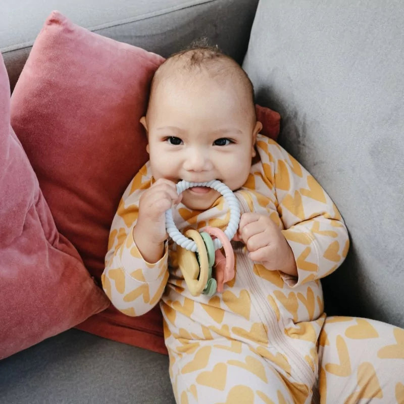 De bijtring heeft verschillende vormen en texturen, die de zintuigen van kinderen stimuleren terwijl ze hun tandvlees laten wegzakken in het zachte siliconenmateriaal van 100% voedingskwaliteit.