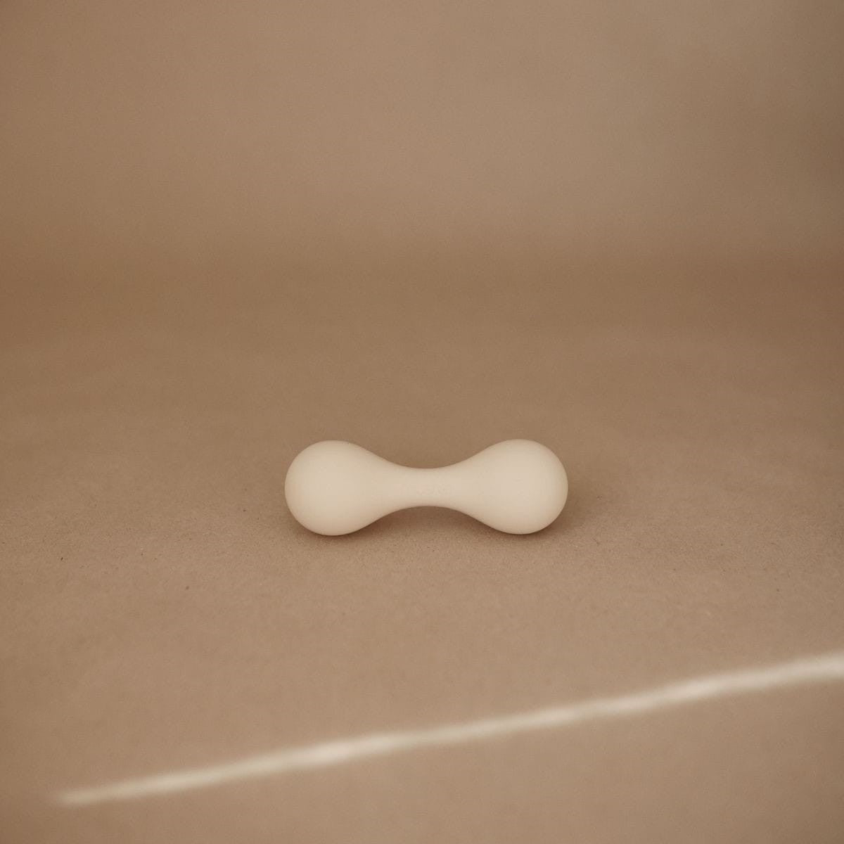 De babyrammelaar heeft een strak design en is verkrijgbaar in vele zachte kleuren.
