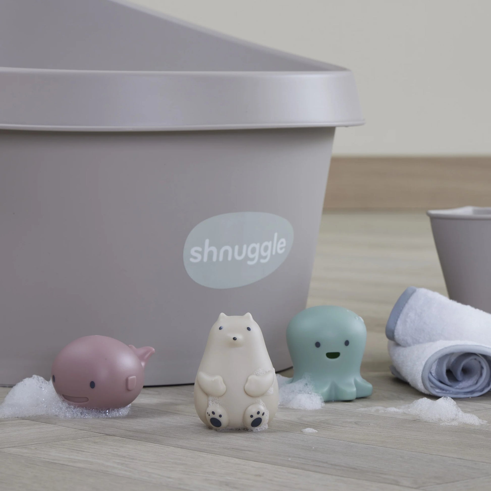 De Bath Buddies zijn ontworpen om schimmelvorming te voorkomen. De octopus en de walvis kunnen gemakkelijk uit elkaar worden gehaald om schoon te maken en te drogen, terwijl de ijsbeer waterdicht is om de verzegelde batterij te beschermen. Veilig, duurzaam en gemaakt van BPA-vrije, niet-giftige materialen: de Shnuggle Bath Buddies zijn ontworpen voor speels leren en gemoedsrust.
