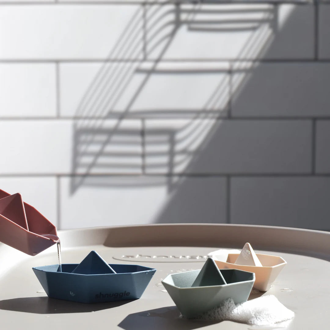 Set van 4 stapelbare siliconen badbootjes voor eindeloos fantasierijk speelplezier in bad, van baby tot peuter en ouder.