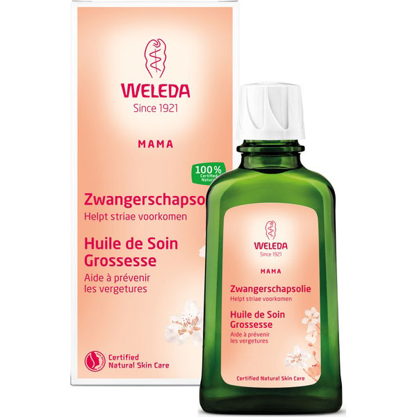 Door je huid soepel te houden en dagelijks in te smeren met Weleda Zwangerschapsolie kan je striemen helpen voorkomen. De combinatie van zoete amandelolie, tarwekiemolie en biologische jojoba-olie voedt de huid intensief, reguleert het vochtgehalte en ondersteunt het herstellend vermogen van de huid. Arnica-extract bevordert de doorbloeding van de huid en verbetert de elasticiteit van het huidweefsel waardoor haar spankracht verbetert. Pure etherische oliën van o.a. lavendel, wilde roos en sinaasappelbloesem zorgen voor een subtiele geur en brengen tot rust.