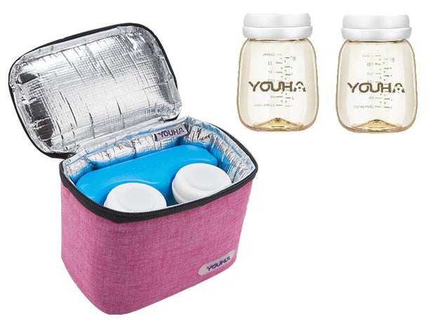 Houd moedermelk onderweg koel en veilig met de geïsoleerde Youha koeltas met meegeleverde koelelement en twee moedermelk flesjes. Het maximaliseert de bewaartijd van je moedermelk of andere producten die koel gehouden moeten worden. Het design is trendy en modern. De moedermelk koeltas is handig mee te dragen met het handvat aan de bovenkant. De moedermelk koeltas kan in de koelkast geplaatst worden en op de twee moedermelk flesjes kunnen handig eigen spenen op gemonteerd worden zodat de baby makkelijk kan drinken.